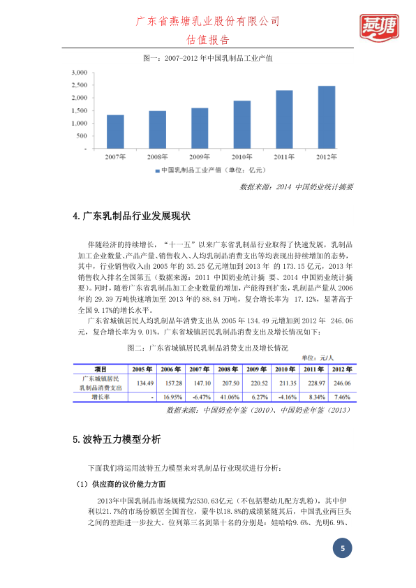 这是一份完成于2015年6月的专业估值报告,以燕塘乳业为切入点,系统梳理了中国及广东区域乳制品行业的宏观环境、政策演进与竞争格局。报告涵盖宏观经济区间调控与定向调控逻辑、质检总局进口注册新规、农业部‘卖奶难’应对政策、婴幼儿配方乳粉兼并重组路线图等关键政策解读;详实呈现广东乳制品销售收入(2013年达173.15亿元,全国第五)、产量复合增速(17.12%,显著高于全国均值)等区域亮点;并运用波特五力模型,深入剖析供应商议价能力较强、购买者议价能力较弱、新进入壁垒持续抬升等结构性特征。适合金融从业者、行业研究员及关注区域消费龙头的投资人参考。