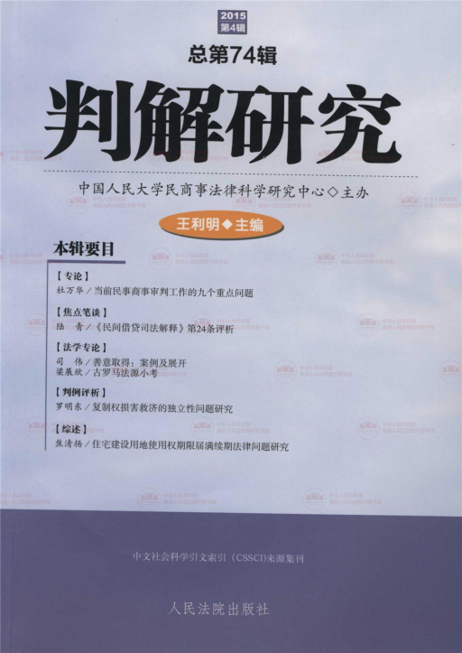 📚《判解研究》是由中国人民大学民商事法律科学研究中心主办、王利明教授主编的CSSCI来源集刊,长期聚焦中国民商事审判实践与法律解释学发展。本辑(2015年第4辑,总第74辑)内容扎实、视角多元:既有杜万华大法官对民事商事审判九大重点问题的权威梳理;也有对《民间借贷司法解释》第24条的精细评析;还涵盖善意取得实务案例、古罗马法源考辨、复制权救济独立性等理论与判例交织的深度探讨。特别值得关注的是焦清扬关于住宅建设用地使用权续期的系统综述,直面社会关切。全书立足司法一线,兼具学术严谨性与实践指导性,是法学研究者、法官、律师及研究生不可多得的参考读物。