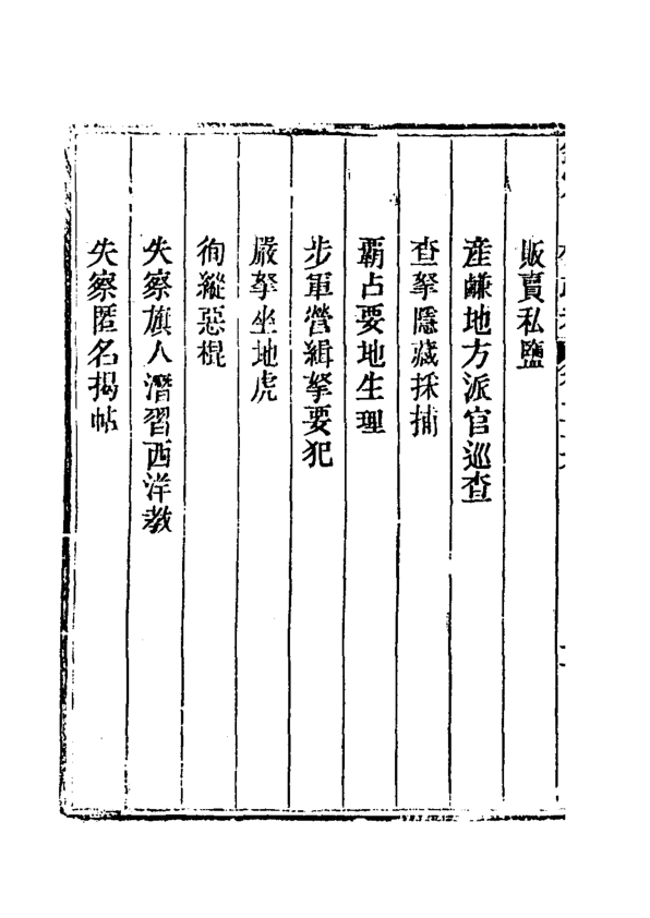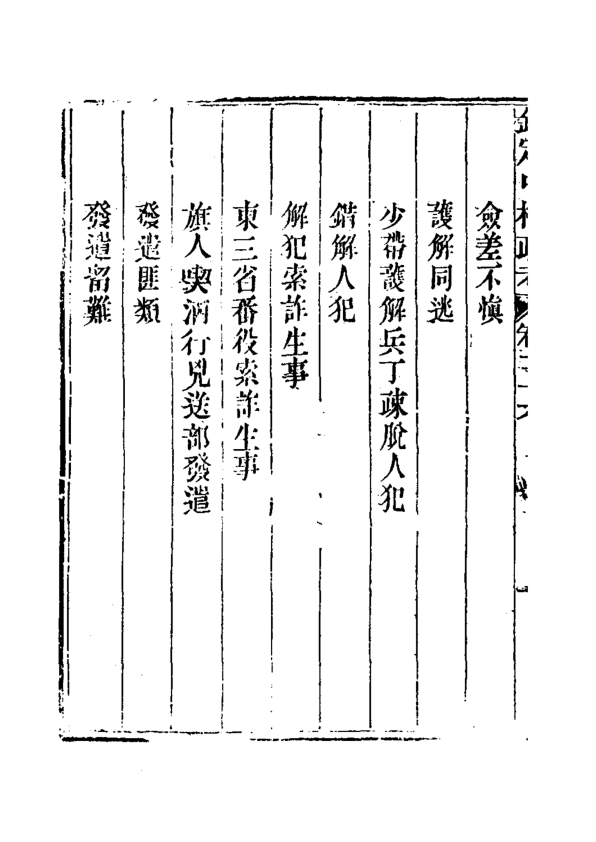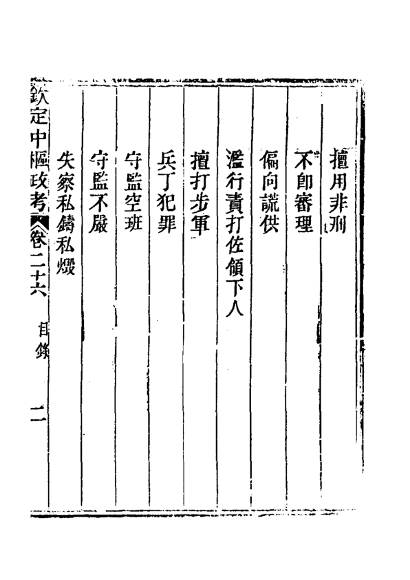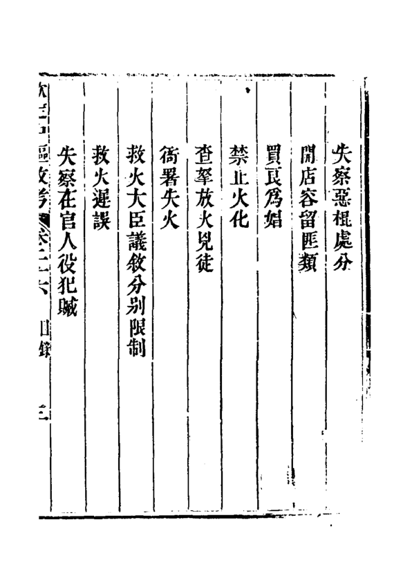 这是一部清代官修政书《钦定中枢政考》的卷二十二(内容片段显示实为卷二十六目录,疑刊刻或装订错简),聚焦中枢机构对旗务、刑名、缉捕、流遣、监禁、救火及地方稽查等政务的规范与考成制度。目录条目密集详实,如“递解质审旗员”“重犯拨兵护解”“审流遣犯盛暑隆冬停遣”“失察旗人潜习西洋教”等,生动呈现乾隆至嘉庆时期中央对八旗管理、司法执行与社会控制的精细化运作逻辑。虽非完整正文,但作为清代行政法典类文献的典型样本,对研究清代官僚考成、旗人司法特权、基层治安机制及中西接触下的官方应对极具史料价值。