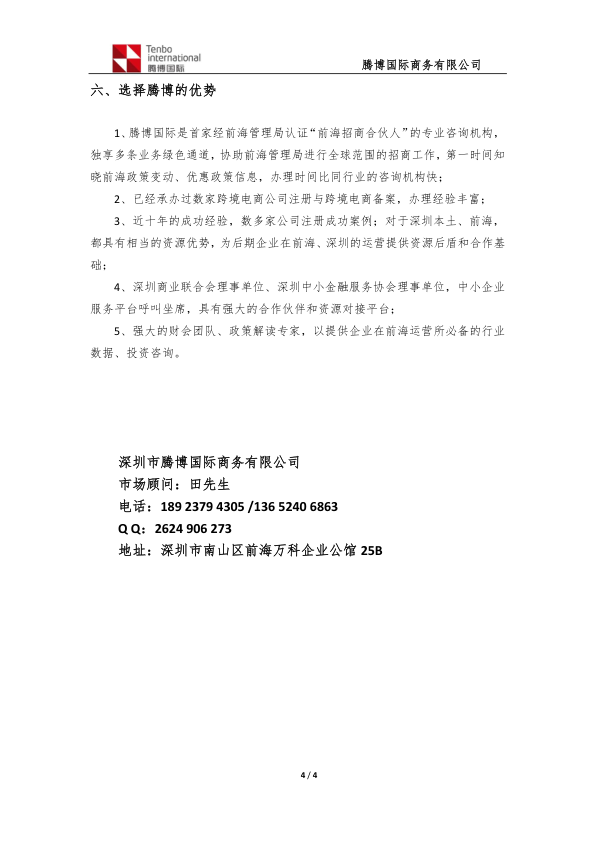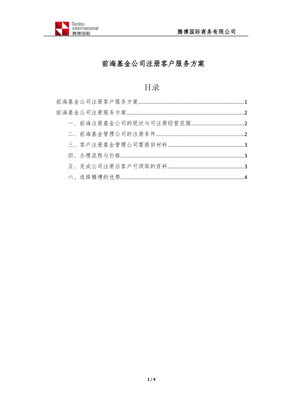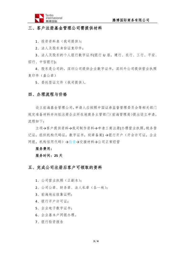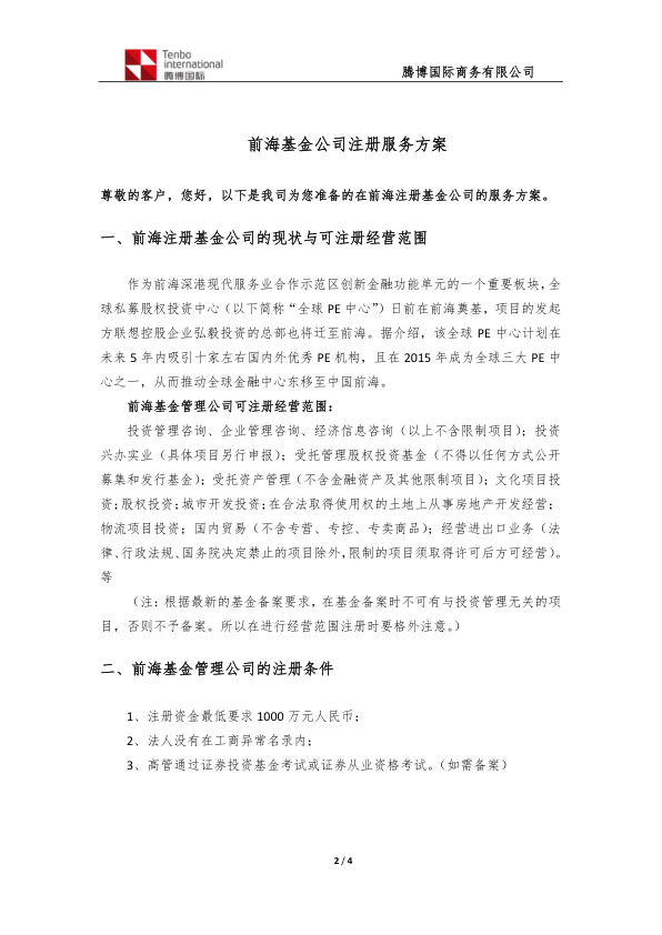 这是一份面向拟设立私募基金管理人的实操型服务方案,核心围绕前海地区基金公司注册展开。内容涵盖政策背景(如全球PE中心建设)、可选经营范围(明确标注备案敏感项)、注册硬性条件(如1000万实缴、高管从业资格要求)、所需材料清单(含U盾、数字证书等细节)、标准化办理流程(25天周期)及交付成果(执照、印章、开户许可等)。特别提示了基金业协会备案对经营范围的严格限制,具备较强时效性与合规警示价值。虽由咨询机构腾博国际编制,但信息结构清晰、条款具体,适合作为初创私募团队快速了解注册门槛与关键节点的入门参考。