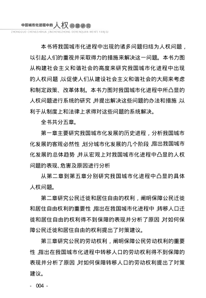 这是一部立足中国现实、具有鲜明问题意识的学术著作。面对每年超千万人口向城市加速转移的时代图景,本书独辟蹊径,将农民工市民化、户籍壁垒、劳动权益缺位、居住自由受限等典型现象,系统提升至‘人权’维度进行宏观审视。不同于常见的社会学或经济学单维分析,作者以马克思主义和中国特色社会主义理论为指导,紧扣十六大、十七大关于城乡人口转移与人权保障的政策精神,重点探讨迁徙居住自由、劳动权利、社会保障、教育文化权利等经济社会文化权利的结构性缺失,并深入剖析其历史成因与制度根源。全书逻辑清晰、立场坚定、对策务实,既具理论高度,又富现实关怀——不是空谈人权理念,而是直面‘名副其实地转移’这一城市化健康发展的核心命题。