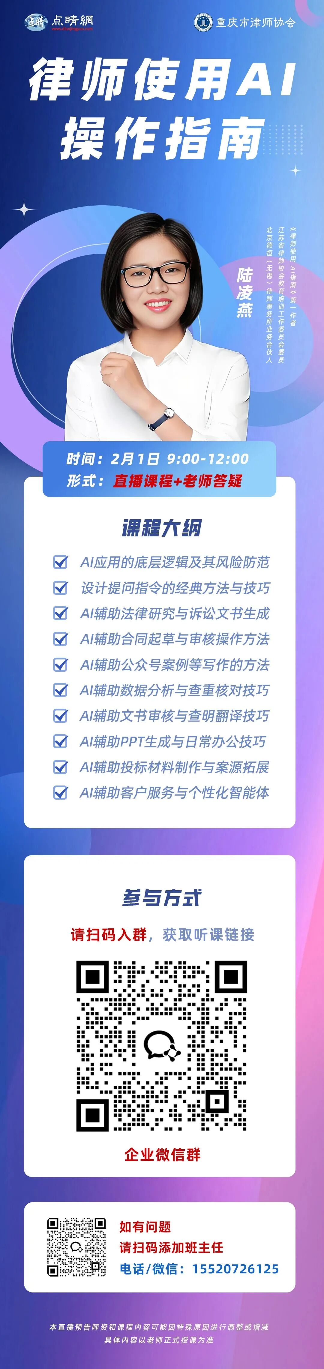 本次直播将从 AI应用的底层逻辑及其风险防范、 设计提问指令的经典方法与技巧、 AI辅助法律研究与诉讼文书生成、 AI辅助合同起草与审核操作方法、 AI辅助公众号案例等写作的方法、 AI辅助数据分析与查重核对技巧、 AI辅助文书审核与查明翻译技巧、 AI辅助PPT生成与日常办公技巧、 AI辅助投标材料制作与案源拓展、 AI辅助客户服务与个性化智能体 等方面 进行深入的分析和解读。