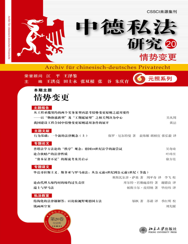 📚CSSCI来源集刊《中德私法研究》第20卷聚焦‘情势变更’这一民法核心议题,融合中德比较视角与实务关切。开篇主题报告以建设工程合同中的‘物价涨跌型’与‘工期延展型’判决为切入点,深入探讨适用要件,并借鉴《德国民法典》第313条‘交易基础理论’,反思契约严守与契约正义的平衡。书中既有吴从周等学者对‘行为基础’概念的译介与重构,也有合伙财产性质、‘资本显著不足’源流等专题论文;译文部分涵盖罗马法商事传统与缔约过失责任比较研究;‘私法教室’更以‘钱画两空案’示范结构化法律问题解答方法。理论扎实、视野开阔、兼顾教义与实践,是研习民法变动原则与比较私法不可多得的学术资源。