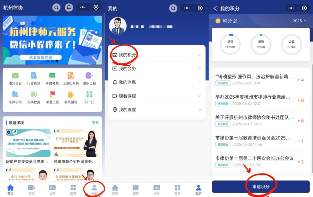 1.准备证明材料,进入“杭州律协小程序”,点击【我的】-【我的积分】-【申请积分】选择【培训积分】填写信息并上传证明材料。核对无误后,确认提交。