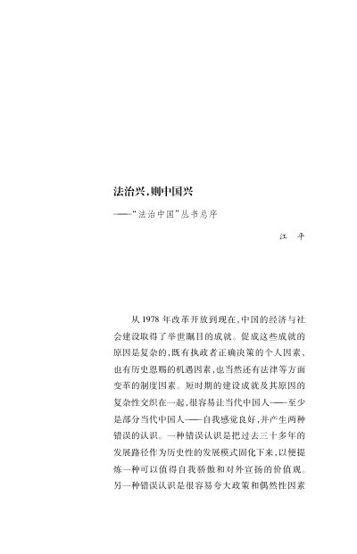 全书结构清晰:从概念辨析出发,到文明秩序重构,再到现实障碍剖析,最终落脚于建设路径。前言与江平先生所作‘法治中国’丛书总序尤为精彩——前者直指规则中心主义之蔽,后者以‘历史三峡’为喻,强调法治是避免社会滑向失序、实现民族复兴的唯一制度性基石。
