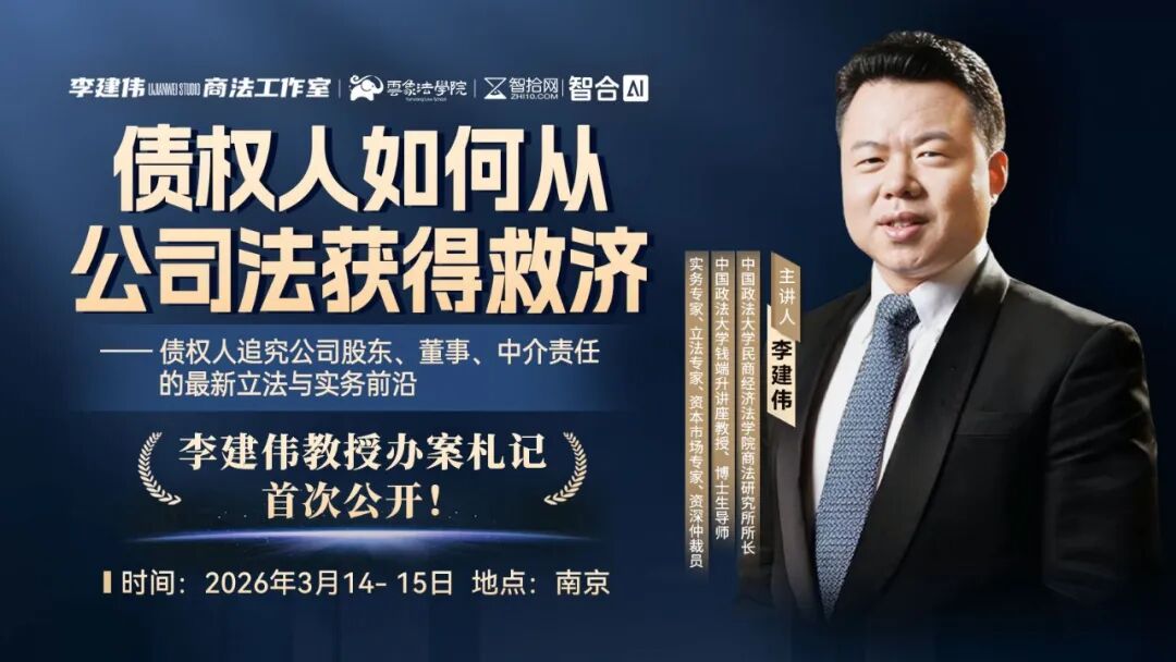 2026年3月14-15日 , 智拾网联合李建伟商法工作室、云象法学院,特邀 立法、法理、实务三栖民商事专家李建伟教授, 于南京 带来线下训练营,聚焦 债权人的公司法救济实务 !