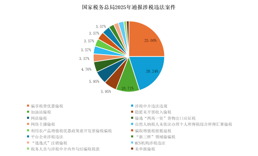 从案件类型来看,骗享税费优惠案件共21件,占比最高(25.00%),成为年度重点打击领域。其中,违规享受小规模纳税人、小微企业税收优惠以及研发费用加计扣除优惠的案件尤为突出。涉税中介违法违规案件(占比20.24%)与加油站偷税案件(占比10.71%)也占比较高,体现出对专业服务机构与典型高风险行业监管的同步强化。此外,针对网络主播、网店、平台企业及MCN机构的监管,以及对自然人个税汇算清缴、企业“逃逸式”注销等行为的查处,共同构成了年度执法行动的立体图景。