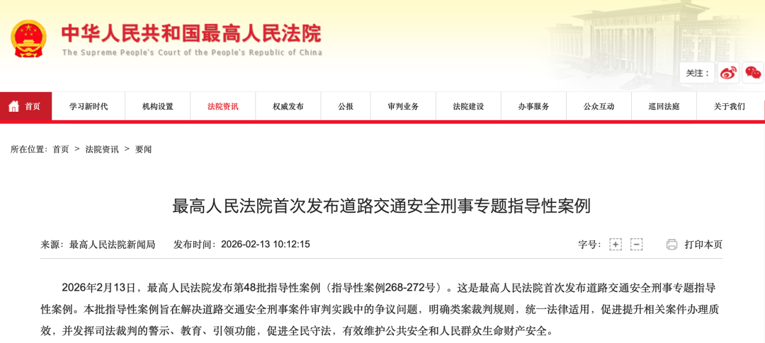2026年2月13日,最高人民法院发布第48批指导性案例(指导性案例268-272号)。这是最高人民法院首次发布道路交通安全刑事专题指导性案例。