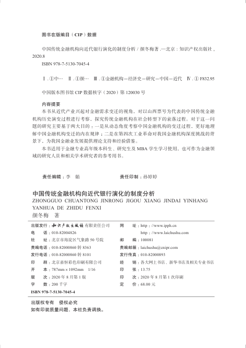这是一部聚焦中国金融近代化关键转折点的扎实学术著作。作者颜冬梅博士以山西票号为典型样本,系统梳理其从鼎盛到衰亡的四阶段演进,并深入剖析甲午战争后产业勃兴、政府政策转向(如银行立法、财政改革)、以及票号自身制度缺陷(产权模糊、无限责任、路径依赖、金融与产业脱节)等多重因素如何共同导致其无法成功演化为近代银行。全书兼具金融史纵深与制度经济学视角,不仅还原了晚清至民初金融生态的真实张力,更在第四次工业革命背景下,为理解金融制度与实体经济的动态适配关系提供了珍贵的历史镜鉴。适合金融史、经济史、制度经济学方向的师生及研究者研读。