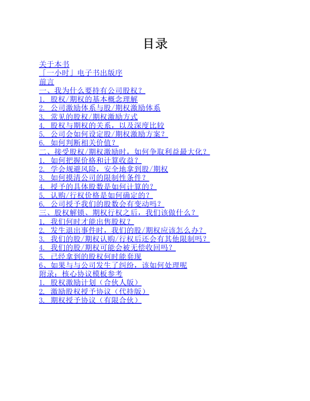 这本出自知乎「一小时」系列的短小精悍电子书,由资深股权激励实务专家方君祥撰写,专为普通员工量身打造。不同于常见的‘企业端’股权设计指南,本书罕见地切换至被激励者视角,直击核心问题:当公司抛来期权/股权方案时,你真的看懂条款背后的权责利了吗?书中以第一人称娓娓道来,用平实语言厘清股权类型、行权条件、税务成本、退出机制等关键概念,并结合真实服务经验提醒常见陷阱。没有晦涩理论,只有务实判断框架——帮你把‘画饼’看成‘契约’,把‘福利’当作‘资产’。通勤一小时,建立职场进阶中不可或缺的股权素养。