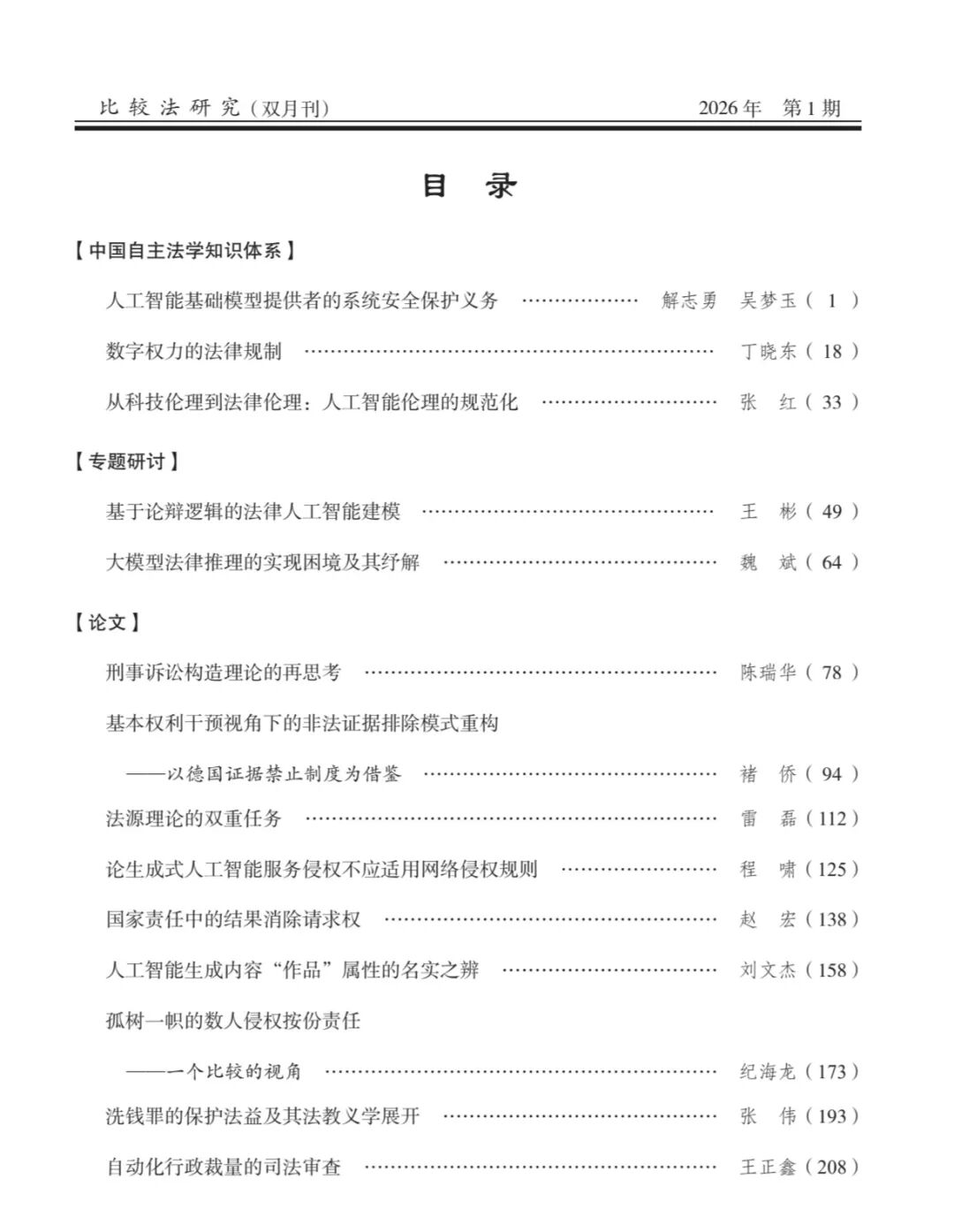 《比较法研究》2026年第1期要目