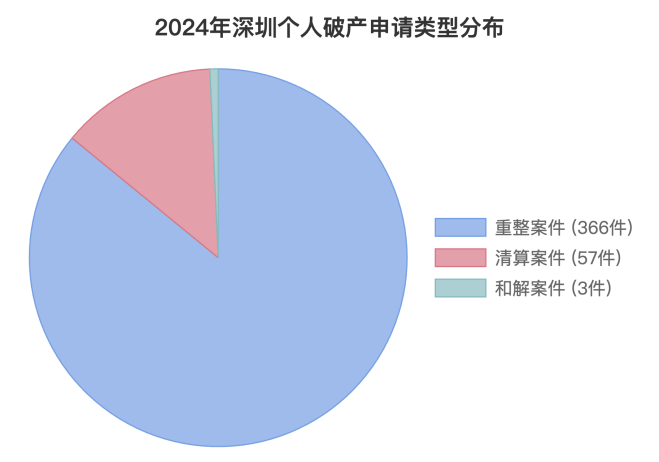 自2021年3月1日《深圳经济特区个人破产条例》实施以来,2024年深圳新收个人破产申请426件(清算57件、重整366件、和解3件),案件总量呈年度波动,结构从初期清算主导转向重整为主。数据显示,申请人更理性选择对信用影响小、灵活性高的重整程序,清算次之,和解最少。法院受理态度审慎,2024年受理个人破产案件147件,其中重整占比86%,较2023年的99.32%略有下降。