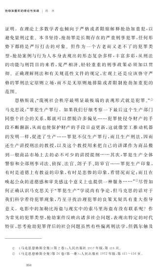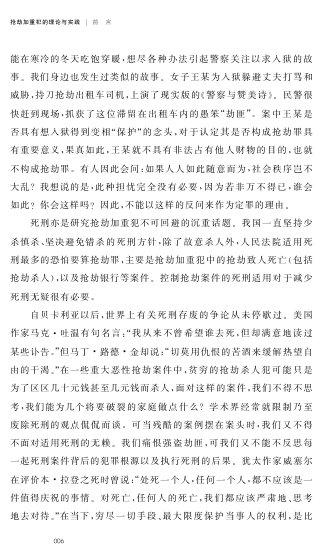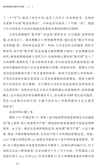 本书源于作者在法院与法学院十余年的实务与教学积淀,聚焦我国刑法中争议频发的‘抢劫加重犯’问题。从1997年刑法修订到司法解释的适用困境,作者系统梳理了抢劫罪八类加重情形在实践中的认定难题,如‘入户抢劫’的界限、‘多次抢劫’的认定、‘为抢劫而杀人’的定性等,直面死刑适用与罪刑法定的深层冲突。书中不仅有扎实的法理分析,更融入对犯罪背后社会现实的深切关怀——从‘接妻劫匪’到为入狱求庇护的女性,揭示犯罪背后的复杂人性。这不仅是一部刑法专著,更是一次理论与实践交织的深度对话。