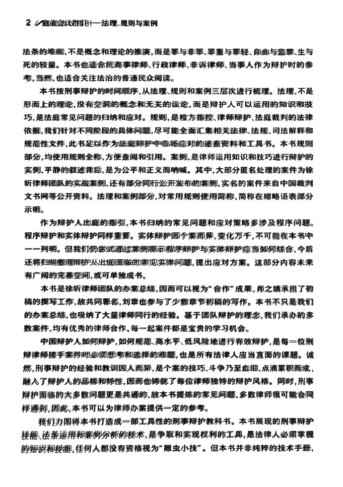 本书由知名刑辩律师徐昕及其团队倾力打造,聚焦刑事辩护中的关键环节——庭前会议,系统梳理法理、规则与典型案例,兼具理论深度与实战价值。全书以问题为导向,提炼出庭前准备的常见挑战与应对策略,涵盖程序辩护、证据排除、法律适用等核心议题,堪称刑事辩护的‘操作手册’。书中大量匿名实战案例来自真实庭审,辅以详尽法规索引和缩略语说明,便于律师快速查阅、精准引用。不仅适合刑辩律师案头常备,也为民商事、行政律师及法科学生理解刑事诉讼实务提供宝贵窗口。这不仅是一本技术指南,更是对辩护理念的深刻诠释:在对抗中寻求沟通,在规范中实现有效辩护。
