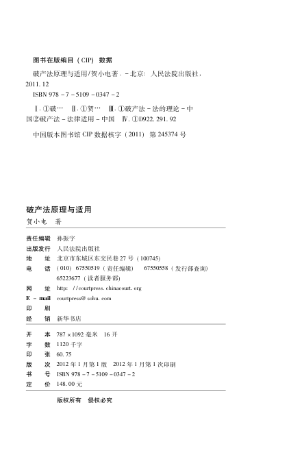 本书由贺小电主编,人民法院出版社出版,是一部全面系统阐述中国破产法理论与适用的权威著作。全书以《企业破产法》为核心,结合司法解释与实务操作,深入剖析破产程序中的关键问题,涵盖破产原因、管理人制度、债权申报、重整与清算等核心内容。书中引用大量司法文件并辅以严谨的体例规范,兼具学术深度与实践指导价值,适合法官、律师、法务人员及法学研究者参考使用。前言部分深刻探讨了破产的社会本质与法律应对逻辑,展现出作者对破产制度的人文关怀与理性思考。是理解中国现代破产制度不可多得的综合性读本。