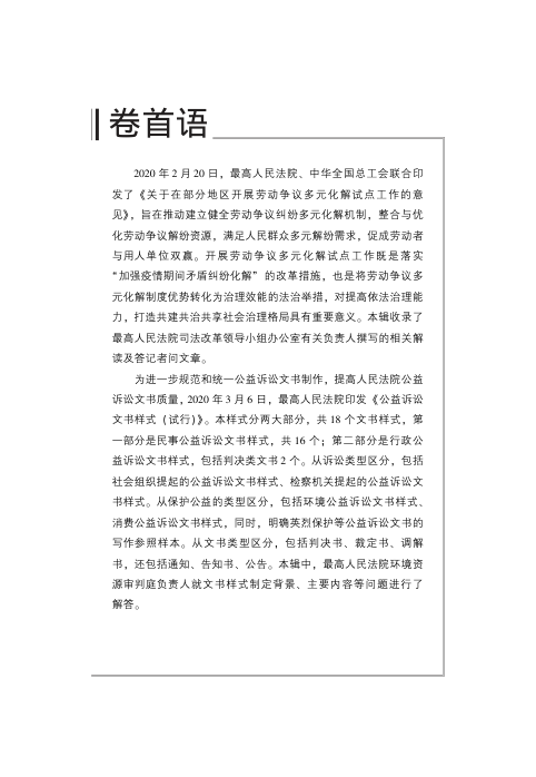 本期《民事法律文件解读》聚焦2020年最新司法动态,权威收录最高人民法院及相关机构对重点法律文件的官方解读。内容涵盖劳动争议多元化解试点工作的政策背景与实施路径,深入解析《关于进一步完善委派调解机制的指导意见》等重要文件,助力纠纷化解机制优化。同时,针对公益诉讼实践需求,详细解读《公益诉讼文书样式(试行)》的制定思路与适用要点,覆盖民事、行政公益诉讼各类文书模板,涉及环境、消费及英烈保护等多个领域。适合法官、律师、法务及研究者参考使用,是把握当前民事司法改革动向的重要资料。