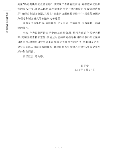 本书以“民事判决既判力”为核心,深入剖析这一民事诉讼法学五大基础理论之一的关键议题。作者丁宝同在长期学术积累基础上,构建了严谨的四层逻辑体系:从效力构成的宏观视野切入,系统梳理既判力的本质、根据与作用形态,并结合大陆法系与英美法系的制度经验,拓展理论边界。尤为可贵的是,本书打破程序法与实体法的壁垒,以请求权理论为桥梁,揭示既判力制度背后的民事实体基础,直面立法与司法实践中的深层问题。书中还前瞻性地提出既判力制度构建及判决瑕疵救济程序完善的立法建议,具有强烈的现实关怀。田平安教授盛赞其“构思巧妙、论证有力”,是推动我国民事诉讼理论走向成熟的重要成果。