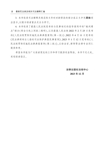 本书由法律出版社法规中心权威编纂,是民法典施行后全面整合最新司法解释与典型案例的实用汇编。收录《中华人民共和国民法典》全文,每条附有“条文主旨”,便于快速检索与理解。同步收录最高人民法院发布的多项司法解释、规范性文件及三批民法典相关典型案例,涵盖合同、物权、婚姻家庭、继承、人格权保护等重点领域。特别标注修改条文,配套指导案例“裁判要点”及全文阅读二维码,助力法官、律师、法学生高效实务操作与理论研究。第四版紧跟2023年最新立法与司法动态,内容全面、编排清晰,是法律从业者案头常备的权威参考。