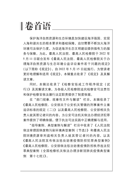 本期《刑事法律文件解读》总第203辑(2022.05)由人民法院出版社权威编撰,聚焦最新司法动态与实务指导。重点收录最高人民法院、最高人民检察院联合发布的《关于办理海洋自然资源与生态环境公益诉讼案件若干问题的规定》及其深度解读,回应海洋生态文明建设的司法需求。同时涵盖公安机关管辖刑事案件立案追诉标准(二)的最新修订内容,并收录检察官惩戒工作程序的试行规定,助力规范司法责任制度。典型案例部分精选固体废物污染环境、妨害疫情防控犯罪等代表性案例,兼具指导性与实践价值,是刑事司法、环境公益诉讼及检察实务工作者的重要参考资源。