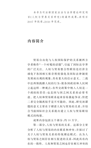 本书是樊静教授主持的司法部国家法治与法学理论研究项目的最终成果,系统探讨了贸易自由化与人权保护之间的复杂关系。作者从理论与实践双重维度出发,分析了人权与贸易的内在一致性与现实冲突,梳理了生命权、环境权、劳工权益等与贸易密切相关的人权范畴,并深入剖析了企业社会责任、技术贸易壁垒、动物福利壁垒等新型人权相关贸易壁垒的成因与影响。书中还对联合国、WTO、欧盟等国际组织的相关立法进行了评价,结合《美国与柬埔寨双边纺织品贸易协议》等案例,提出构建人权与贸易整合性联结模式的可行路径。最后,立足中国现实,提出了我国在外交立场与政策应对上的建设性思路。本书资料翔实、逻辑严谨,是国际法、经济法及公共政策研究者与实务工作者的重要参考。