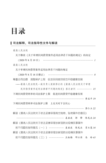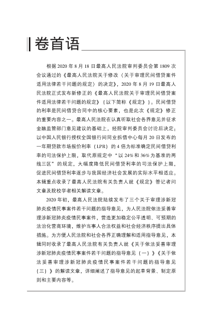 本期《民事法律文件解读》聚焦2020年民事司法领域的两项重大调整:一是最高人民法院新修正的《关于审理民间借贷案件适用法律若干问题的规定》,首次以LPR的4倍作为民间借贷利率司法保护上限,取代原有的“两线三区”标准,大幅降低融资成本;二是围绕新冠肺炎疫情发布的三份涉疫民事案件审理指导意见,为合同履行、劳动争议、企业纾困等提供司法裁判指引。本书收录了最高法相关负责人答记者问及权威学者解读,兼具实务指导与理论参考价值,是法官、律师、法务及研究者把握政策动向的重要参考资料。