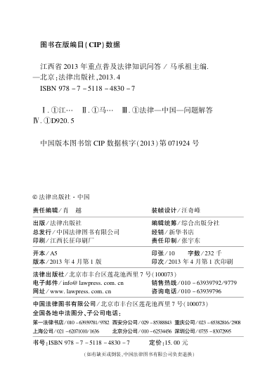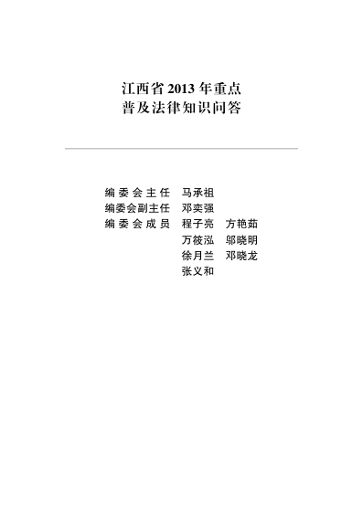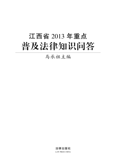 本书由马承祖主编,法律出版社于2013年出版,是江西省当年重点推进的普法宣传读物。全书以问答形式系统解读与群众生活密切相关的法律知识,内容通俗易懂,贴近实际,适用于基层干部、社区居民及广大普法工作者学习参考。作为一本地方性法治普及资料,本书结构清晰,聚焦实用,是了解当时江西法治宣传教育重点的可靠窗口。适合用于法律入门学习或地方普法工作参考资料。