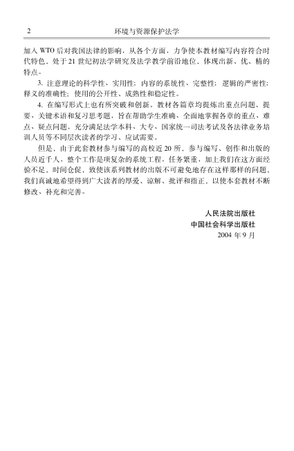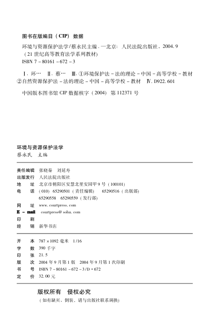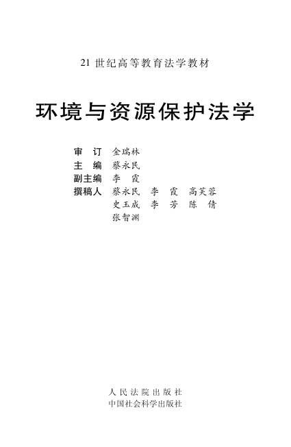 本书由蔡永民主编,金瑞林审订,作为“21世纪高等教育法学系列教材”之一,系统构建了环境与资源保护法学的知识体系。内容紧扣我国现行法律法规,融合教育部教学基本要求与国家司法考试需求,兼顾理论深度与实务应用。全书涵盖环境保护法与自然资源法的基本原理、制度框架及最新发展动向,特别关注加入WTO后中国环境法治的应对与演进。结构清晰,每章设有重点问题、术语解析与思考题,适合法学本科生、司法考试备考者及环境法研究者使用。由人民法院出版社与中国社会科学出版社联合出版,凝聚多所高校专家学者智慧,体现权威性与时代性。
