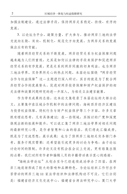 本书为中国法学会主办的第四届“海峡法学论坛”学术成果的集结,围绕“两岸经贸合作与权益保障”这一核心议题,汇集了来自大陆、台湾、香港200多位法学专家与实务工作者的研究论文。内容涵盖区域合作中的法律机制、海峡西岸经济区建设、投资权益保护、侵权责任与财产权保障等关键领域,既有理论深度,又具政策参考价值。作为一部聚焦区域经济一体化进程中法治协同与权益维护的重要文集,本书为理解两岸三地法律协作提供了扎实的学术基础,是法学研究者、政策制定者及法律实务人士的重要参考资源。