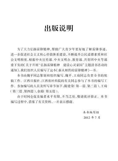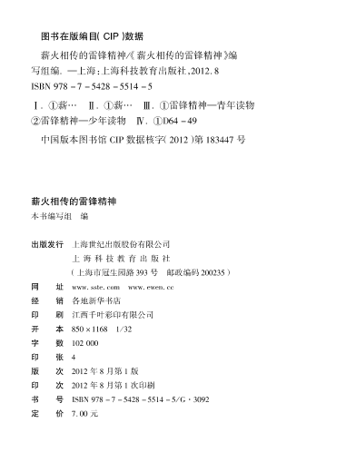 本书由《薪火相传的雷锋精神》编写组编撰,上海科技教育出版社出版,是一本面向青少年读者的雷锋精神普及读物。全书围绕雷锋的生平事迹与精神内涵,系统梳理了其在新时代背景下的传承价值,旨在帮助青少年树立正确的价值观,弘扬社会主义核心价值观。书中内容结构清晰,语言平实生动,适合作为学校德育教育和主题读书活动的推荐读本。本书出版于2012年,配合当时全国范围内的‘弘扬雷锋精神’主题教育活动,具有较强的现实意义与教育功能。
