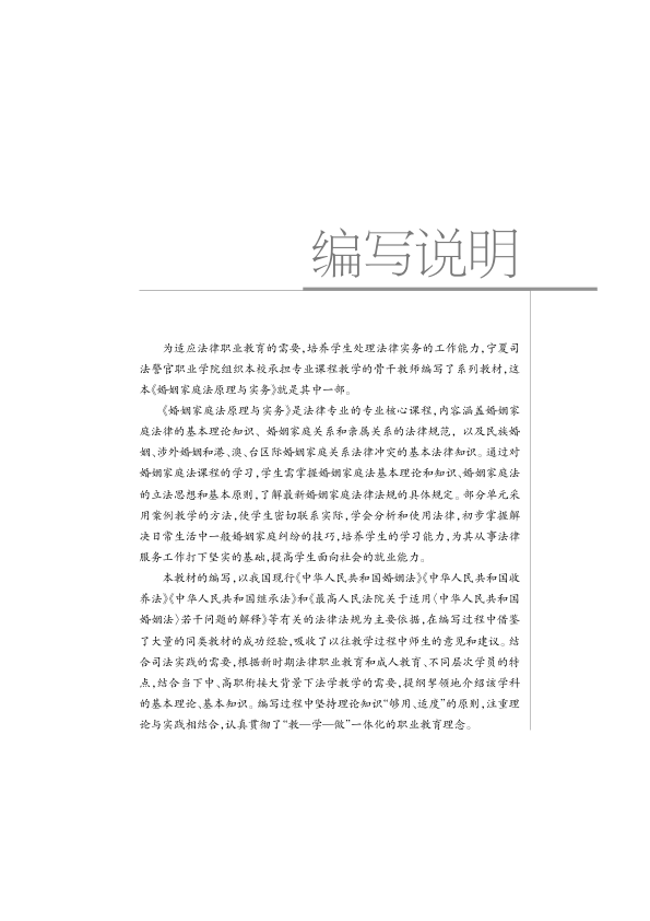 教材立足司法实践需求,体现“教—学—做”一体化的职业教育理念,帮助学生掌握解决常见婚姻家庭纠纷的实务技能,提升法律服务岗位的适应力与就业竞争力。适合法律专业师生、基层法律工作者及备考人士参考使用。