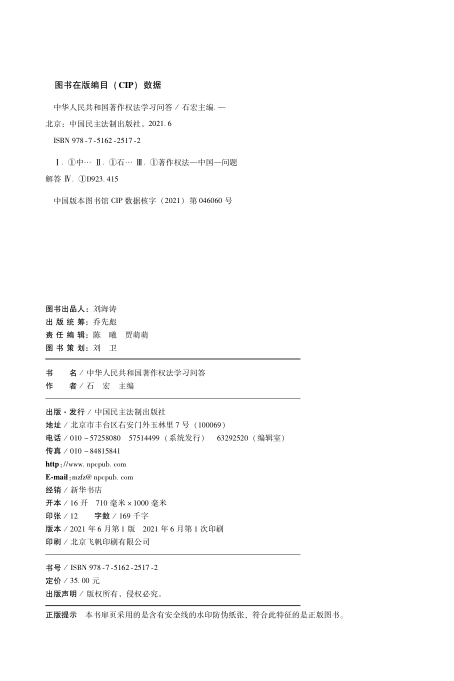 本书由全国人大常委会法制工作委员会民法室副主任石宏主编,系统解读2021年6月1日起施行的《中华人民共和国著作权法》第三次修正案。全书采用问答形式,深入浅出地解析法律条文的立法背景、核心概念与实务应用,涵盖作品范围、权利归属、权利限制、集体管理等关键议题。内容紧贴最新修法动态,兼具权威性与实用性,是法律从业者、创作者、知识产权研究人员及高校师生理解中国著作权制度的重要参考。