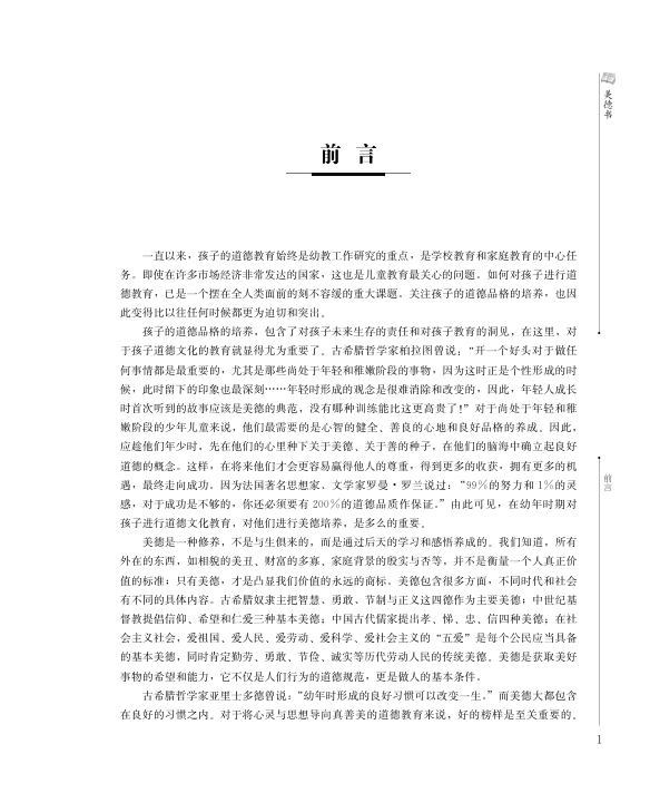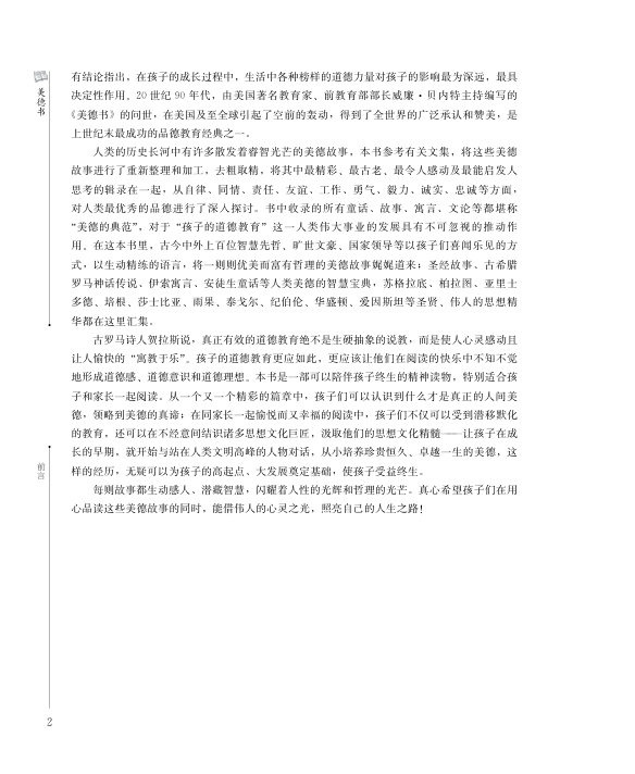 《美德书》由胡雪丹、李卫荣编译,是一部专为青少年打造的品德教育读物。本书从自律、同情、责任、友谊、勇气、诚实等维度出发,精选古今中外百余则经典故事、寓言与哲思篇章,涵盖伊索寓言、安徒生童话、圣经故事、古希腊神话及苏格拉底、柏拉图、莎士比亚、爱因斯坦等思想巨匠的精神智慧。全书以生动语言传递美德力量,倡导在阅读中潜移默化地塑造孩子的道德意识。前言强调“幼年时形成的观念最难改变”,呼吁通过典范故事在孩子心中种下善的种子。这不仅是一本儿童读物,更是一本适合亲子共读、启迪心灵的精神成长指南。
