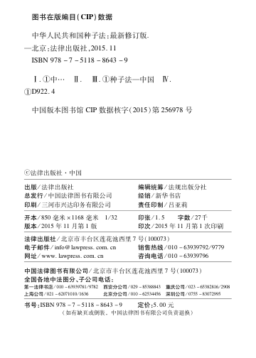本书为法律出版社2015年出版的《中华人民共和国种子法》最新修订版,依据第十二届全国人大常委会第十七次会议通过的修订内容整理,自2016年1月1日起施行。全书涵盖种质资源保护、品种选育与审定、新品种权保护、种子生产经营等核心章节,是农业从业者、法律工作者及政策研究者了解种子行业法治框架的重要参考资料。文本结构清晰,权威性强,适合查阅与学习。