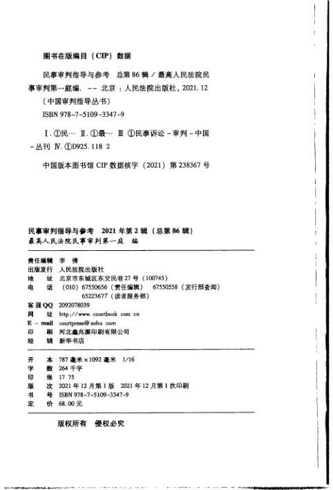 本书为最高人民法院民事审判第一庭编写的《民事审判指导与参考》系列的第86辑(2021年第2辑),由人民法院出版社权威出版。作为“中国审判指导丛书”的重要组成部分,本书聚焦民事审判实务中的前沿与疑难问题,汇集审判政策解读、典型案例分析及司法解释理解适用等内容,具有极强的实践指导价值。适合法官、律师、法务人员及法学研究者阅读参考。信息源自封面与编委会名单,内容专业、体系严谨,是了解中国民事司法动态的重要资料。