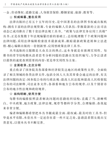 本书是“政策与法律实务应用工具箱丛书”中的重要一册,聚焦中国房地产及物业管理领域的政策与法律实践。第二版紧跟最新立法动态,全面收录国家法律法规、司法解释及地方规章,特别强化对《国有土地上房屋征收与补偿条例》等热点政策的整理与解读。丛书突出“政策比法律更管用”的现实导向,专为普通民众、法律从业者及房地产相关人士设计,帮助快速查找、理解并应用关键规定。