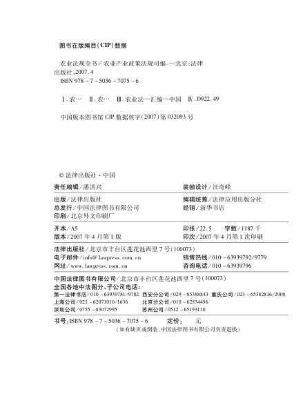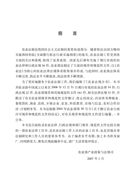 本书由农业部产业政策与法规司权威编纂,系统收录新中国成立以来至2006年底现行有效的农业法律、行政法规、农业部规章及相关规范性文件,涵盖种植业、畜牧兽医、渔业、农机、农垦、农村合作经济等多个领域。作为一部全面、实用的农业法律工具书,其内容权威、分类清晰,是农业法制实务、政策研究和行政执法的重要参考。适合农业管理部门、法律从业者及科研院校相关人员查阅使用。