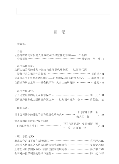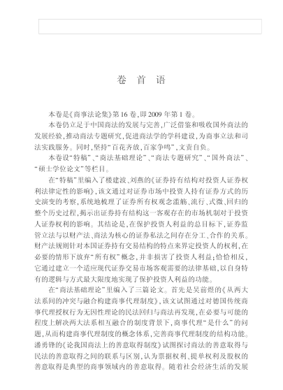 《商事法论集 总第16卷》(2009年第1卷)立足中国商法发展,融汇比较法视野,深入探讨商法理论与实践中的关键议题。本书设‘特稿’、‘商法基础理论’、‘国外商法’及‘硕士学位论文’等栏目,内容涵盖证券持有结构对投资人权利的影响、商事代理制度的体系构建、商法善意取得的特殊性等热点问题。其中特稿《证券持有结构对投资人证券权利法律定性的影响》系统梳理了证券所有权观念的演变,揭示市场机制与法律规则的互动逻辑。本卷还收录四篇优秀硕士论文,涉及股东大会决议效力、公司人格否认、股票期权激励与公司担保制度,展现青年学者的学术锋芒。是商法研究者、实务工作者了解当时学术动态的重要参考。