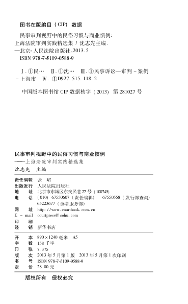 本书由沈志先主编,聚焦民事审判中民俗习惯与商业惯例的适用问题,汇集上海法院的典型司法实践案例,展现法律与社会习惯之间的互动与融合。内容涵盖地产行业惯例在股权置换中的运用、绝当后所有权争议等实务热点,兼具理论深度与实践价值。作为了解中国地方法院如何援引非正式规范进行裁判的重要参考,本书对法官、律师、法学生及研究者具有较高借鉴意义。文字严谨,案例详实,是民事司法领域不可多得的实务资料。