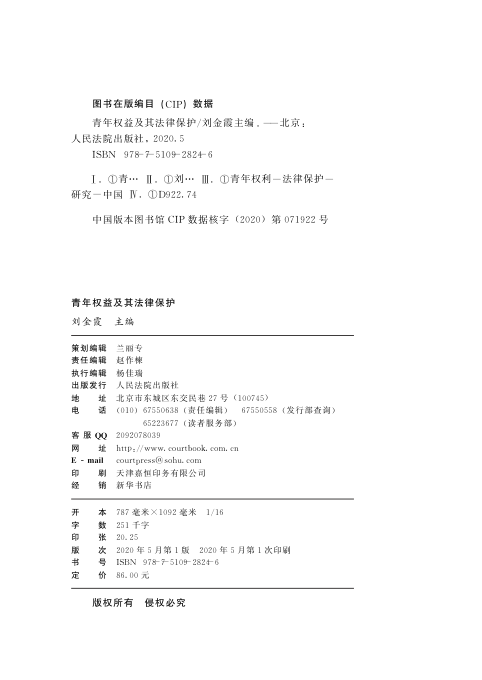 本书由刘金霞主编,系统探讨了中国青年在生存健康、受教育、劳动就业、公共参与、社会保障等领域的权益现状与法律保护机制。基于改革开放以来的政策演进与国际青少年保护标准,书中梳理了我国青少年法律体系的发展脉络,并结合实证研究,深入分析青年权益实现的路径与挑战。前言部分指出,随着权利意识觉醒,青年维权已成为社会常态,而国家也在不断健全制度回应这一趋势。本书不仅具有理论深度,也具备实践参考价值,适合法学研究者、教育工作者、青年工作者及关注青少年发展的读者阅读。