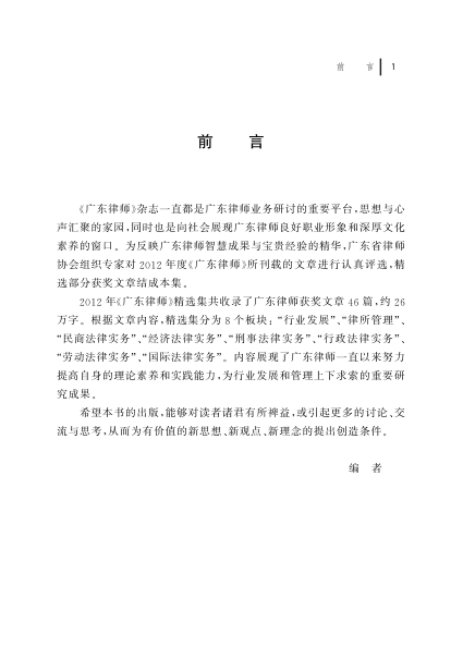 本书汇集了2012年度《广东律师》杂志获奖文章46篇,涵盖民商、刑事、行政、劳动、国际等多个法律实务领域,全面展现广东律师的专业智慧与实践经验。内容由广东省律师协会组织专家精选,兼具理论深度与实践指导价值,是了解当时法律服务前沿动态的重要参考。