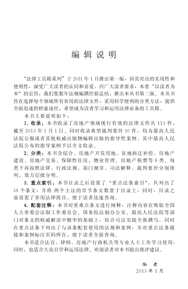 本书是“法律工具箱系列”第二版中的一册,专为房地产领域实务需求打造,收录截至2013年1月1日现行有效的法律文件共113件,涵盖法律、行政法规、部门规章、司法解释等,并精选最高人民法院发布的指导性案例及典型裁判要旨10则,权威性强。