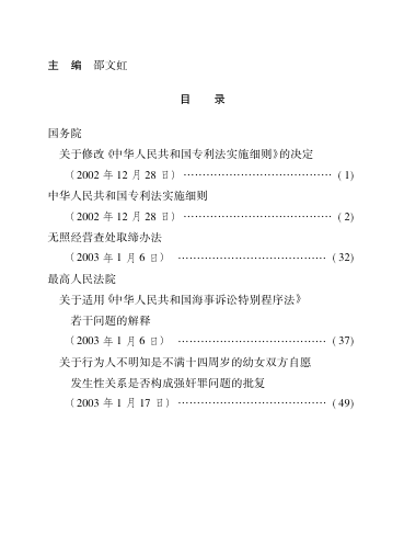 本书由最高人民法院研究室编纂,属‘司法工作丛书’系列,汇集2003年度重要的司法解释、行政法规及规范性文件,是了解当时法律适用背景的重要参考资料。书中收录了《中华人民共和国专利法实施细则》的修订内容,涵盖国际申请进入中国国家阶段的具体程序、时限要求和译文规定等关键条款,对知识产权实务工作者具有较高参考价值。全书以官方文本为基础,体例清晰、来源权威,适合法官、律师、研究人员及法学生查阅使用。虽为早期出版物,但部分内容仍具历史对照意义。