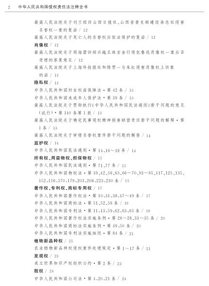 本书以《中华人民共和国侵权责任法》为核心,系统梳理相关法律条文、司法解释及典型案例批复,涵盖名誉权、肖像权、隐私权、监护权、物权、知识产权(著作权、专利权、商标权)、植物新品种权、股权等多个民事权益领域。内容整合最高人民法院复函、民法通则意见、物权法、公司法等关键法规条文,具有极强的实务参考价值,是法律从业者、研究者及司法工作者理解侵权责任边界与权利保护范围的重要工具书。
