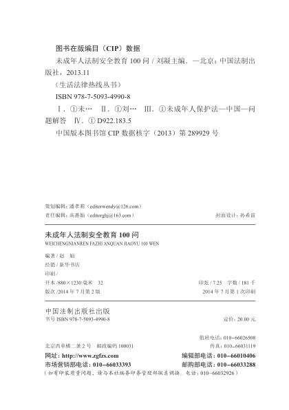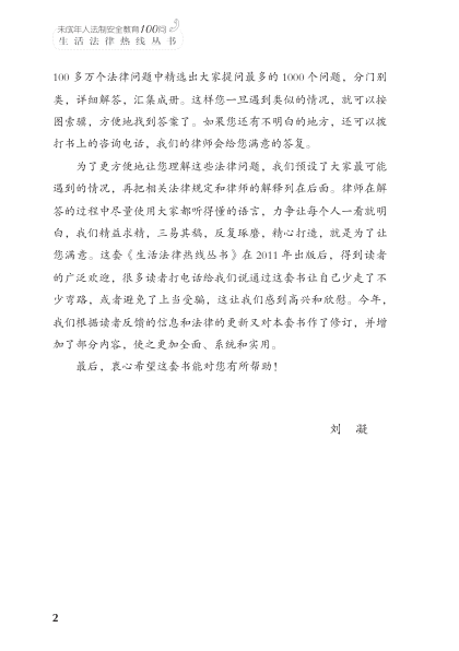 本书是《生活法律热线丛书》中的一册,由资深律师刘凝主编,聚焦未成年人法治与安全教育中的关键问题。全书以问答形式呈现,精选公众咨询中最常见的100个法律问题,涵盖民事权利、刑事责任年龄、学生伤害事故处理、权益保护机制等实用内容。语言通俗易懂,结合法律规定与实际案例,帮助家长、教师和青少年快速掌握基本法律常识。作为2014年修订版,内容紧跟法律更新,更具系统性与实用性。随书还提供公益法律咨询渠道,真正实现‘法律进家庭、进校园’。适合所有关心未成年人成长与安全的读者收藏参考。