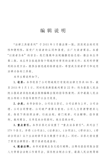 本书由中国法制出版社权威编纂,是“法律工具箱系列”中的经典之作,第二版在广泛听取读者反馈基础上全面升级。全书系统收录截至2013年1月公司领域现行有效的66件法律法规及司法解释,并精选最高人民法院发布的指导性案例和典型裁判要旨22则,涵盖公司设立、治理、证券上市、破产重组、人力资源等七大核心板块。分类清晰,层级分明,配套“重点法条索引”与“常用法律简目”,辅以权威注释和文书范本,实现法律检索与实务应用的高效结合。无论是法官、律师、企业法务,还是法科师生,皆可从中获得精准、实用的法律支持,堪称公司法领域的案头常备工具书。