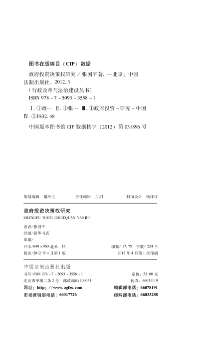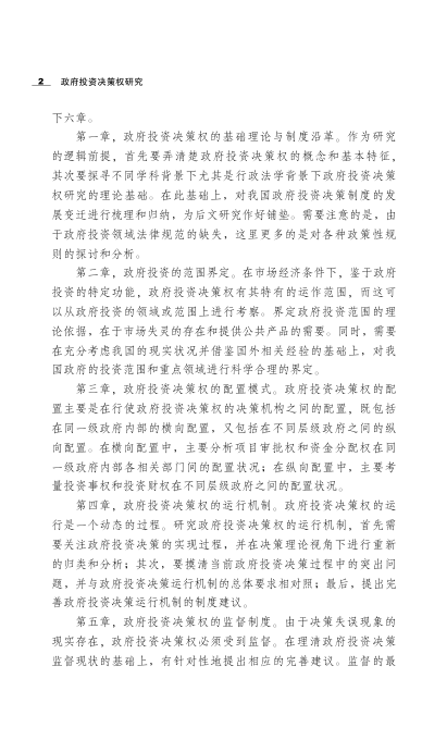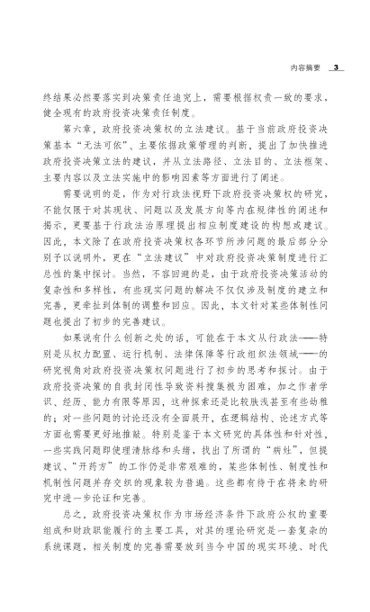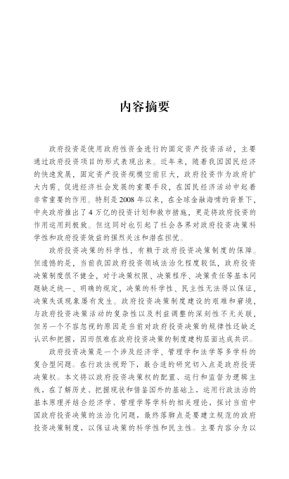 本书立足行政法视角,系统探讨政府投资决策权的理论基础、制度配置与运行机制。作者张国平从权力配置、运行流程到监督问责,层层剖析我国政府投资决策中的现实问题,并结合市场失灵与公共产品理论,科学界定政府投资范围。书中不仅梳理了政策演变脉络,更提出推进立法、健全责任制度等切实建议,力求在体制与法治之间构建平衡。尽管作者自谦研究尚属初步,但其对权力纵向横向配置、决策透明化及法律保障机制的思考,为推动政府投资法治化提供了重要学术参考。适合关注公共财政、行政改革与法治建设领域的读者深入研读。