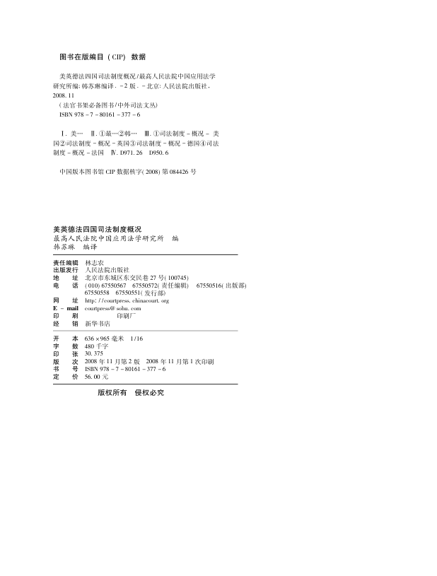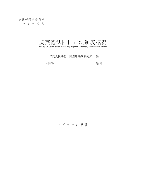 本书由最高人民法院中国应用法学研究所组织编译,韩苏琳女士执笔翻译,是《中外司法文丛》中的重要一员。全书系统梳理了美国、英国、德国和法国的司法制度渊源、法院组织、法官选任、诉讼程序及司法管理等核心内容,兼具宏观架构与微观细节,力求还原四国司法运作的真实图景。