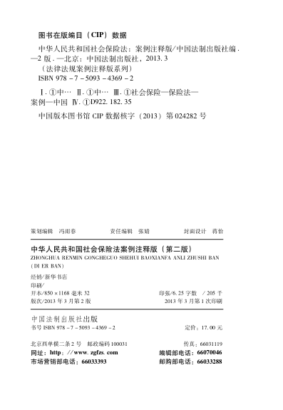 本书为《中华人民共和国社会保险法》的案例注释版第二版,由中国法制出版社权威编撰,立足法律适用实践,通过真实司法判例深入解读法条内涵。全书以‘以案释法’为核心理念,精选各级法院已生效裁判案例,结合立法背景与实务需求,逐条注释法律条文,帮助读者准确理解参保权利义务、社会保险待遇申领条件及缴费机制等关键内容。