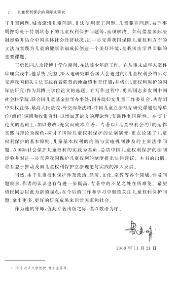 本书以联合国《儿童权利公约》为核心,系统梳理了国际儿童权利保护的法制演变历程,深入探讨了儿童权利的基本原则、权利内涵及实施机制。作者王勇民结合其在法院少年庭的实务经验,通过广泛调研联合国机构、政府机关与学术组织,立足国际视野,关照中国现实,聚焦农村留守儿童、流浪儿童、童工、涉罪未成年人等特殊群体的权利保障问题。书中不仅总结了我国儿童权利保护的立法与实践进展,更提出具有可操作性的制度完善建议。作为一部兼具理论深度与实践关怀的法学专著,本书为推动我国儿童权益法治化提供了重要参考。