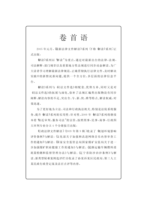 本书为《最新法律文件解读》系列之行政法律分册,2009年第9辑(总第57辑),由江必新主编,立足‘贴近审判、服务司法’宗旨,系统解读最新行政法规与政策文件。本期重点收录《规划环境影响评价条例》及多部部门规章的权威解读,涵盖环境保护、网络音乐审查、煤矿职业健康、车辆燃料监管等领域,兼具实务指导与理论参考价值。特别设置‘新类型疑难案例选评’栏目,精选孙某诉某区民政局行政登记案并附法官点评,展现司法实践前沿问题。内容全、专、新、快、准,是行政法领域立法、执法与司法人员的重要参考资料。